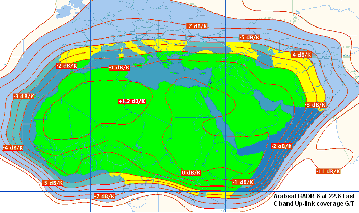 C band coverage beam from Arabsat BADR-6 satellite at 22.6 deg East.