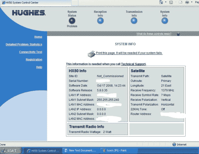Hello all. I am having issues commissiong our HX50 satellite system. I have spoken to the support staff at Bentley-Walker and still can't figure out the issue, they mentioned they were having interference issues yesterday and to wait until today and still not able to commission the modem. I'm posting here to see if I can get any other suggestions to help me fix the issue and get me up and running. I have inputed the configs given to me by Bentley-Walker but the issue seems to be that the transmitter is receiving a TXcode 9 and TXcode 14. The HX50 modem shows we have a Signal strength of 88 percent. I have issued the 'rd' command in telnet to download the new firmwares but it just keeps getting stuck at 'Received RGM'. I have issued the command several times and it still shows the same thing. I have also switched the coaxial cables to verify that it is not a cable issue. My receiving end is fine and does not drop packets, but the transmit side has alot of dropped packets. Could it be a GPS issue? The coordinates we gave Bentley-Walker are of the building the satellite dish sits on and not the actual position of the satellite dish. Is it possible to manually update the modem instead of having it download through the satellite if I could get hold of the latest firmware from BW? Also, in the main screen of the modem gui, i get a diagnostic code of 0000-0000-0400-0041 Below are my config parameters and pictures.