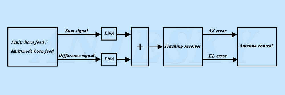 (a) Manual/Programme Tracking (b) Mono–Pulse or Simultaneous Tracking (c) Step Tracking (d) Cone Scan Tracking The first one needs operator intervention when tracking. The latter three techniques can be classified under the general heading of automatic tracking or auto tracking. These schemes represent closed-loop tracking systems and once satellite acquisition has been established, tracking continues with no operator intervention. All auto tracking schemes rely on the reception of a continuous beacon signal transmitted by the satellite. The received beacon signal is used to drive pointing error information which supplies control signals to the antenna drive servo mechanisms. The antenna is driven so as to attempt to minimise the pointing error and hence null the tracking error. (a) Manual and programme steering of antenna tracking system In the absence of an autotracking system, antenna pointing is either undertaken manually or using programmed steering. Manual tracking involves an operator controlling the movement of the antenna until the received signal strength is maximised. Programme steering uses prepared data describing the path of the satellite, seen from the earth station as a function of time. This information is fed to the antenna positioning servo system which points the antenna in the appropriate direction. Please click this page for learning more about programming tracking antenna from 1.8m to 13.0m with X-Y pedestal. (b) Mono-Pulse or Simultaneous Tracking of antenna tracking system Monopulse tracking is an advanced tracking system, which can determine the direction of the antenna beam deviating from the satellite within a pulse interval. When the antenna beam is aligned with the satellite, the antenna can only receive the “sum beam” signal, and the two “difference beam” signal outputs are zero; when the antenna beam deviates from the satellite, the monopulse tracking system can be divided into amplitude monopulse tracking system and phase monopulse tracking system. The amplitude monopulse tracking antenna consists of four feeds and a parabolic reflector. The four feeds deviate from the focus of the parabola and are arranged symmetrically, which will produce four independent beams deviating from the parabolic axis of symmetry. The phase monopulse antenna consists of four feeds and four reflectors. At this time, the four feeds will generate four independent beams parallel to the parabolic axis of symmetry. After the four beam amplitudes or phases are compared, a control signal can be generated to drive the antenna to automatically aim at the satellite. Antesly can provide antenna with mono-pulse tracking , please click this for learning further. Diagram of mono-pulse tracking system Advantage of mono-pulse tracking system Mono-pulse tracking is a closed-loop system, which can obtain a complete angle error signal from each received pulse, and has the advantages of good real-time performance and high tracking accuracy. The tracking speed and tracking accuracy of the monopulse system are several orders of magnitude higher than those of the stepping system and the conical scanning system. Please click this page for learning more about mono-pulse tracking antenna. Disadvantage of mono-pulse tracking system Single pulse tracking requires antenna feed to have tracking fuzzy combiner (primary mode or high-order mode), which is complicated in design and high in cost. And the antenna will always be in motion, which increases the wear and tear of machinery and motors. (c) Step Tracking of antenna tracking system The principle of step tracking is shown in below. Step tracking refers to the constant adjustment of the antenna pointing to the increasing direction of the received signal at a fixed step. Step tracking is also called extreme value tracking. It is a step by step control of the antenna to rotate within the azimuth range and the elevation range, so that the antenna is gradually aligned with the satellite, and the system does not enter until the beacon signal received by the antenna reaches the maximum value, then the antenna will be in rest state. The control system always in rest or track alternately. In step tracking, the movement of the antenna can be divided into search step and adjustment step. The function of the search step is to determine the direction of antenna rotation. The adjustment step is to rotate the antenna one step in this direction. After searching the step action, the whole tracking system starts to work. It usually takes several search steps to determine the direction in which the antenna should rotate. After that, the antenna returns to its original position; then it rotates one step in the direction determined by the search step. This last step is called the adjustment step. The main difference between the adjustment step and the search step is that after the adjustment step, the antenna will not return to its original position, while the search step is different. The computer judges the increase or decrease of the receiving level within an appropriate integration time. If the receiving level increases, the antenna continues to rotate a small angle in the original direction; if the receiving level decreases, the antenna rotates in the opposite direction. The elevation direction and the azimuth direction are repeated alternately, so that the antenna beam can be gradually aligned with the satellite. Diagram of step tracking system Advantage of step tracking The principle and equipment of step tracking are very simple with low in price, and can be easily connected to a computer, which can simplify the feed network. Step tracking can use general beacon receivers or digital receivers instead of complex mono-pulse tracking receivers. With the improvement of satellite position accuracy and the rapid development of microcomputers, more and more fixed ground stations tend to use step tracking. Disadvantage of step tracking The antenna beam controlled by