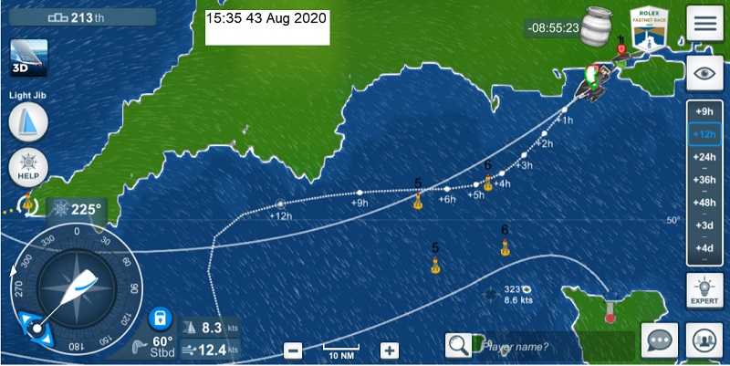 buoy. Also, sail also changed to staysail. After this screen shot was taken I have changed to wind angle locked at 72 deg wich means higher speeds.